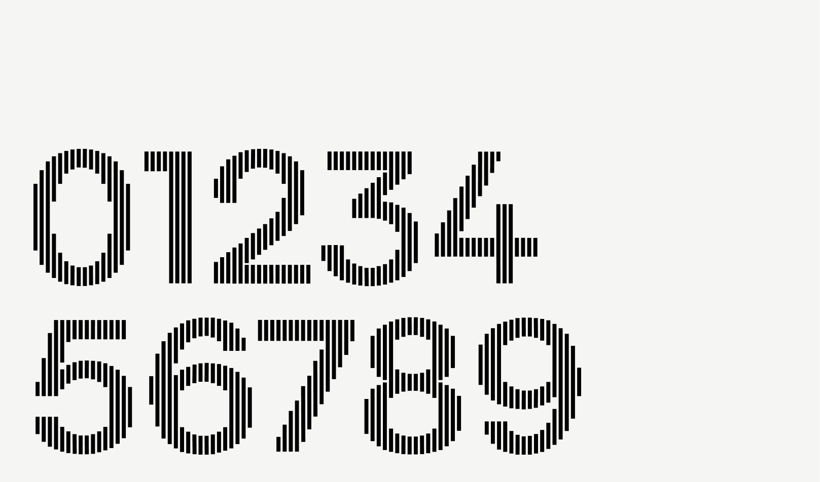 Developed for ISTA, these custom numerals are based on the Surt typeface and subtly connect to the bars in the ISTA logomark and reinforce the underlying grid structure of the brand. These numerals should only be used at larger sizes where numbers are deserving of special attention. Do not use at small sizes.